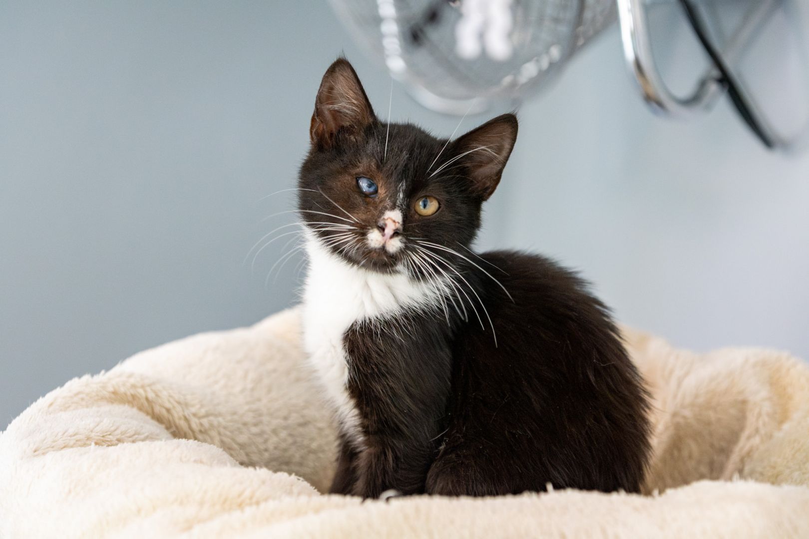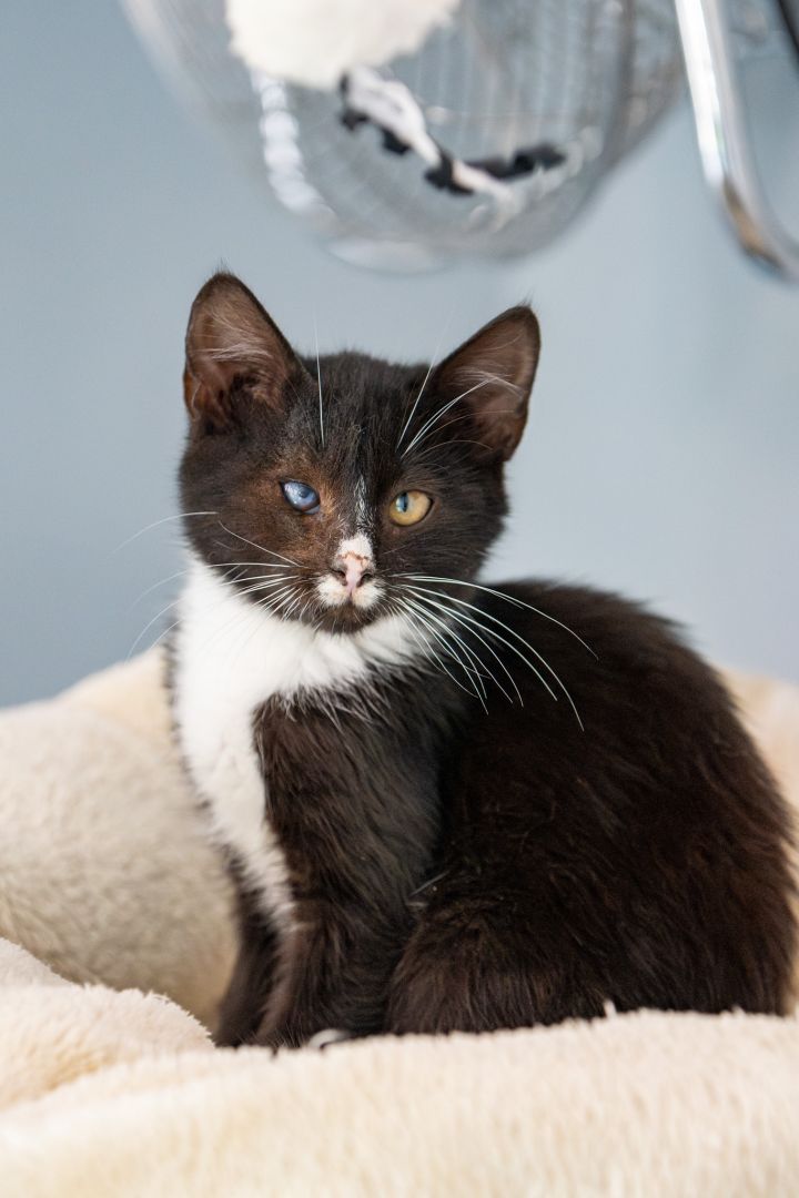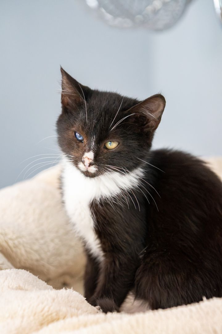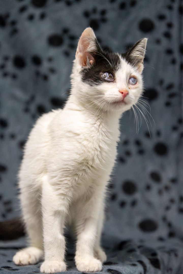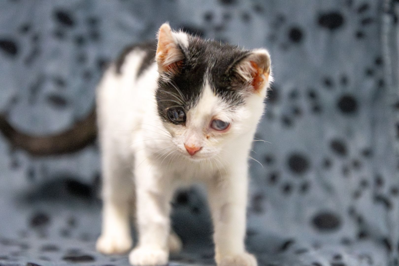 CAŁKA - biało czarna maleńka kotka urodzona w lipcu 2025, która zaznała na starcie problemów ze wzrokiem, spowodowanych nieleczonym kocim katarem.