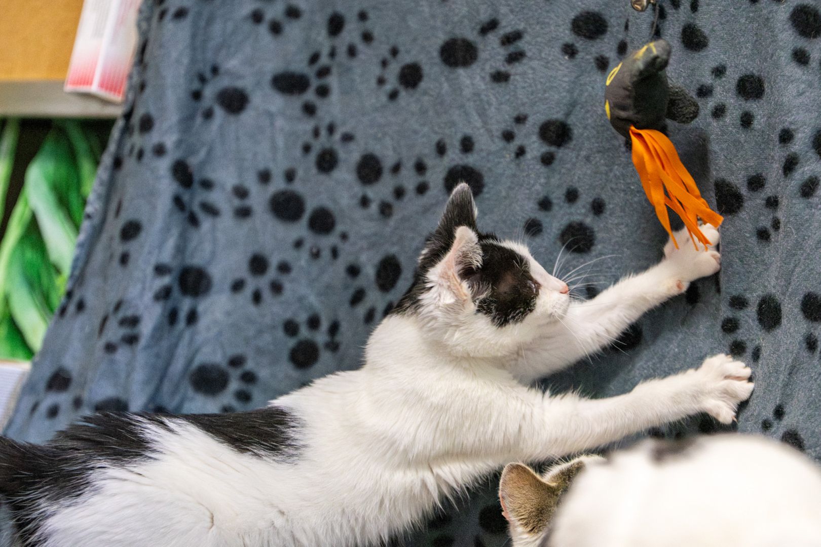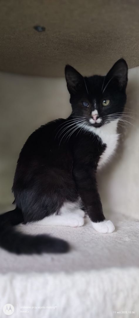 Krokiet - czarny z białym krawatem chłopczyk urodzony w lipcu 2025. Jest przepięknej urody dostojnym kocurkiem. Przeszedł koci katar, który pozbawił go widzenia w jednym oku, drugie jest zdrowe.