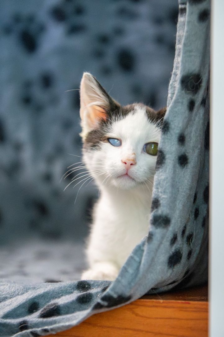 ILOCZYN – biały z czarnymi plamkami na głowie, malutki, wyluzowany, mruczący, urzekający urodą kocur. Urodzony w lipcu 2025