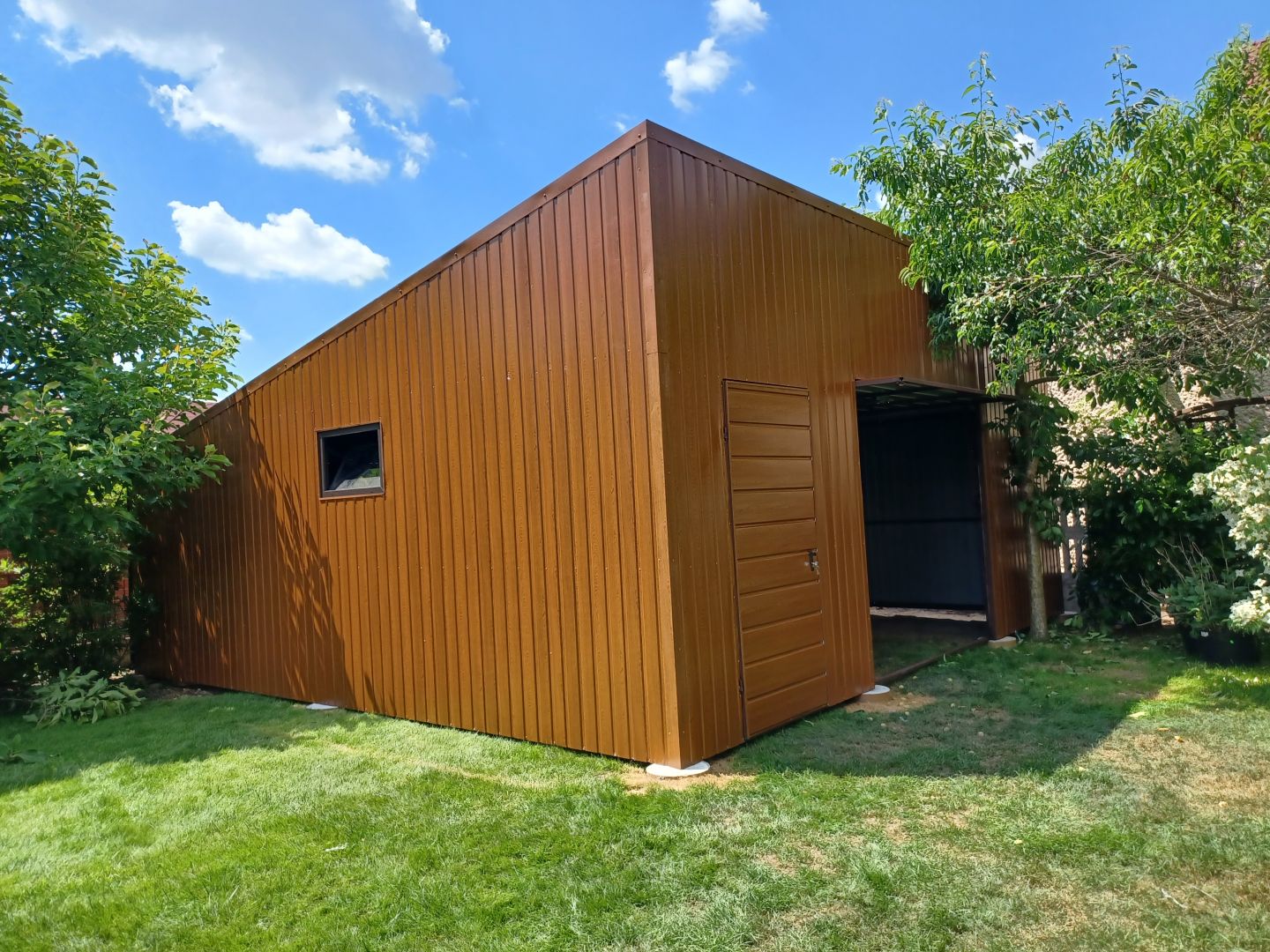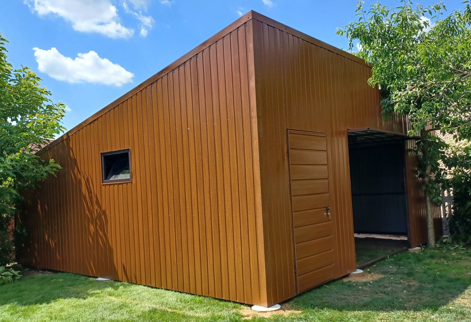 GARAŻ BLASZANY DREWNOPODOBNY - jednospadowy w kolorze "ZŁOTY DĄB " (ładna imitacja drewna ) o wymiarach : 7 x 7m