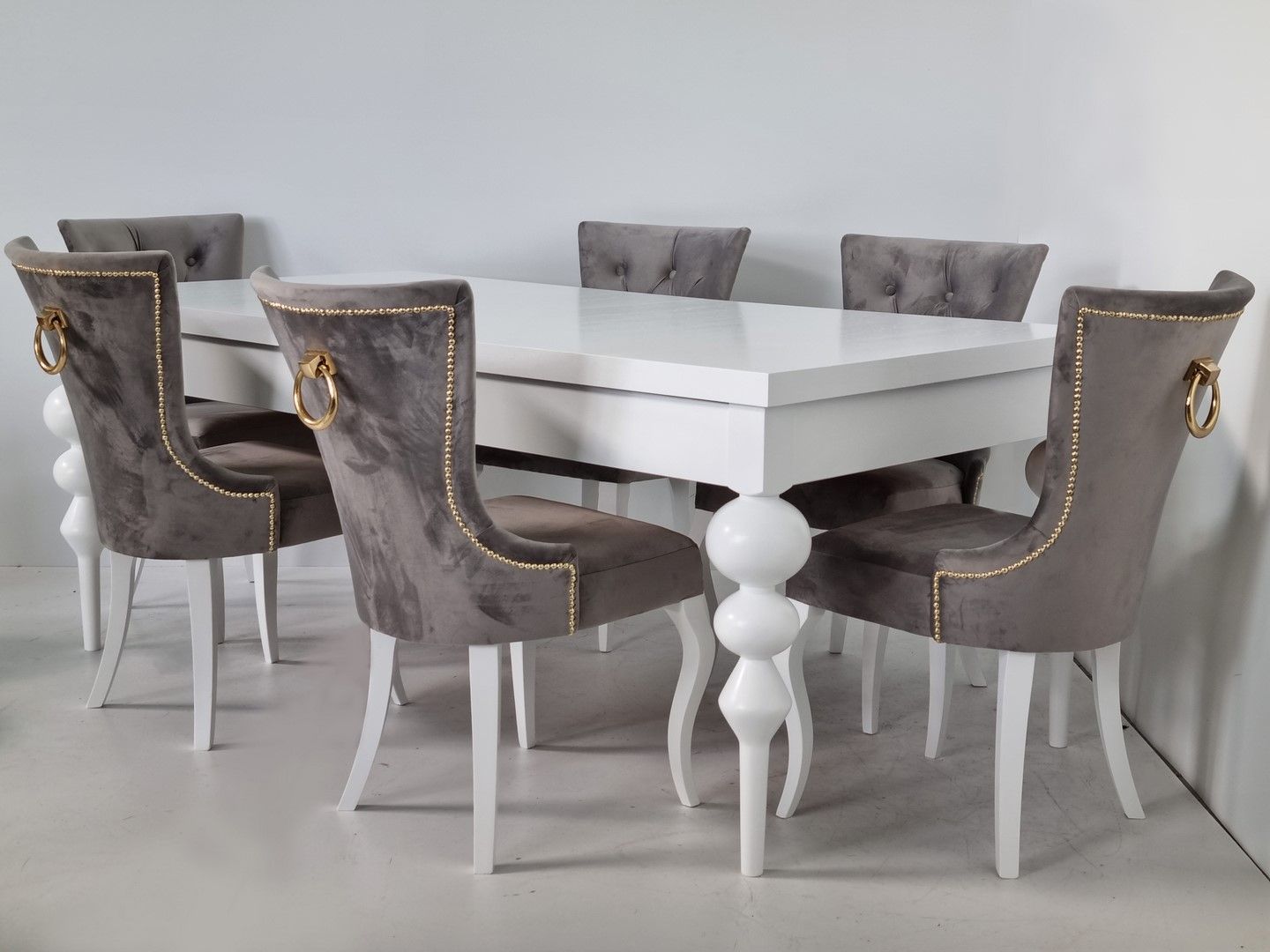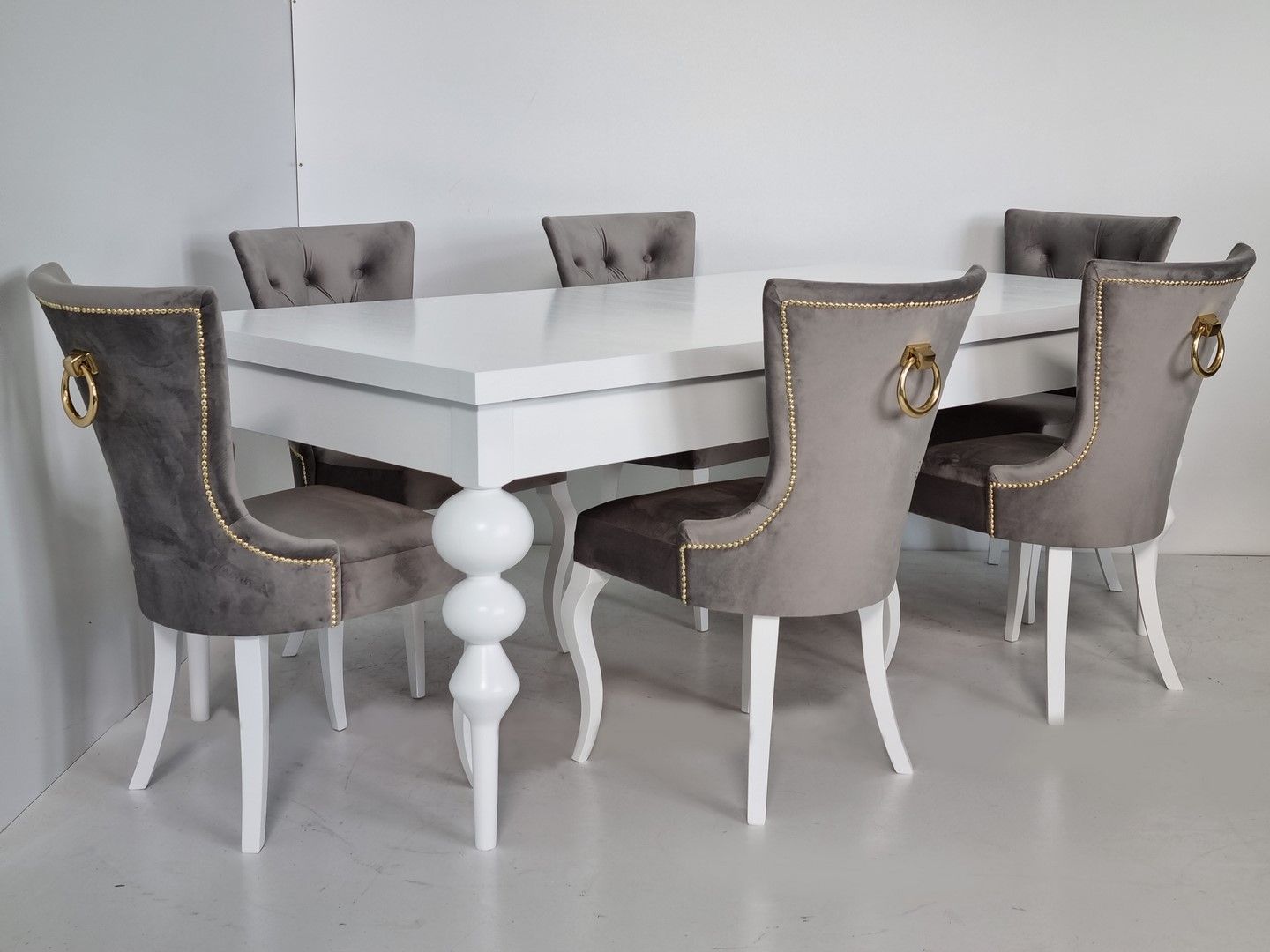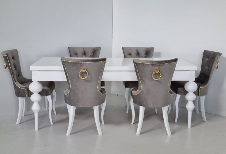 Na zdjęciach prezentujemy komplet składający się z drewnianego stołu o prostokątnym, białym blacie i pięknych, toczonych, białych nogach. Krzesła tapicerowane Dubai posiadają proste nogi i ozdobną, metalową kołatkę na oparciu. Obicie wykonane jest z plamoodpornej tkaniny typu velvet w kolorze szarym.